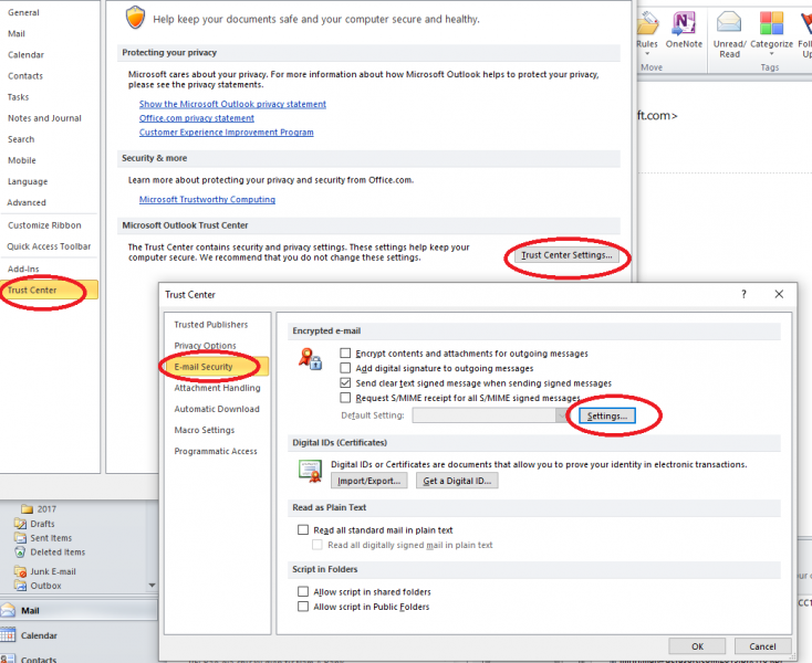 2. Trong màn hình tiếp theo, chọn "Trust Center" rồi chọn tiếp "Trust Center Settings". Trong màn hình tiếp theo, chọn "Email Security" rồi nhấn "Settings" để tiếp tục.