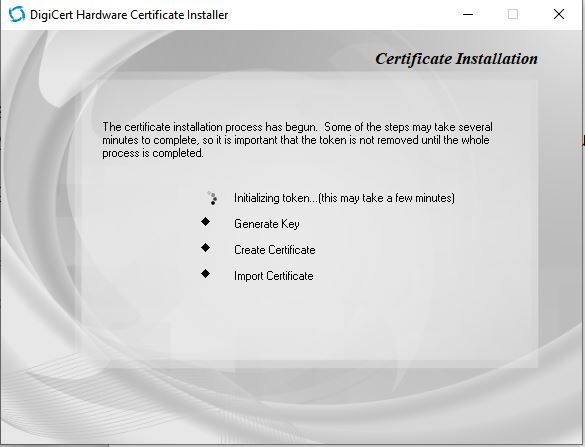 Hệ thống sẽ bắt đầu khởi tạo token, khởi tạo private key sau đó cài đặt chứng thư số Code Signing vào token. Quá trình này có thể mất vài phút. Bạn hãy kiên nhẫn chờ đợi.