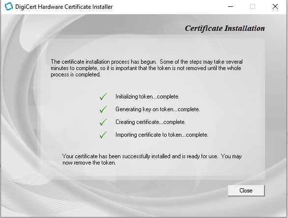 Sau khi quá trình cài đặt hoàn tất, bạn hãy nhấn Close để thoát khỏi công cụ DigiCert Hardware Certificate Installer. Chứng thư số Code Signing trên etoken đã sẵn sàng để bạn ký số cho ứng dụng của mình.