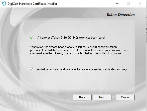 Nếu mọi thứ thuận lợi, màn hình hiển thị thông báo tìm thấy SafeNet eToken sẽ hiện ra. Hãy chọn mục Re-Initializatize my token and permanently delete any existing certificate and keys và nhấn Next để tiếp tục.