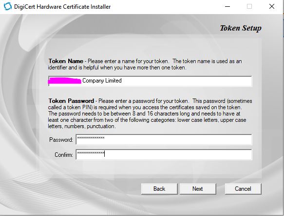 Trong màn hình tiếp theo, nhập vào Token Name để định danh cho chứng thư số Code Signing. Nhập vào mật khẩu (PIN) để bảo vệ cho token. Lưu ý: Bạn cần lưu trữ mật khẩu cẩn thận.