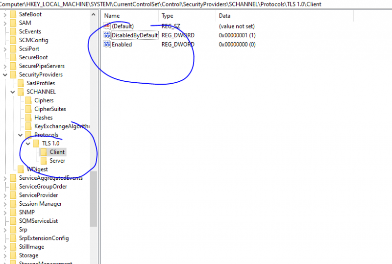 5. Nhất chuột phải vào khóa "TLS 1.0" và thêm mới 2 key con thuộc "TLS 1.0" và đặt tên lần lượt là "Client" và "Server".