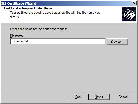 10. Chọn tên file và đường dẫn sẽ lưu trữ tập tin CSR. Nhằm tránh trùng lặp với các file CSR cũ có thể đang tồn tại trên máy chủ, bạn nên chọn tên file theo năm, ví dụ certreq2015.txt.